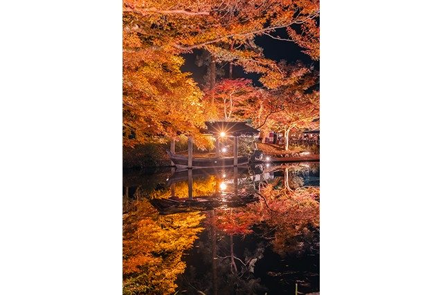 “20世紀最大の木造建築”と言われている長生殿をはじめ、多くの貴重な建築物が立ち並ぶ「大本神苑」。秋になると境内が紅葉で真っ赤に染まり、絶景を織りなします。紅葉が見頃を迎える頃には「綾部もみじまつり」を開催。3日間にわたってライトアップされ、光と紅葉が水面に映る光景は神秘的です。29日と30日には野だてや箏の演奏会、屋台の出店などもあり、お祭りの雰囲気が楽しめます。境内を鮮やかに彩る紅葉を愛でながら秋のひとときを過ごしてみては。