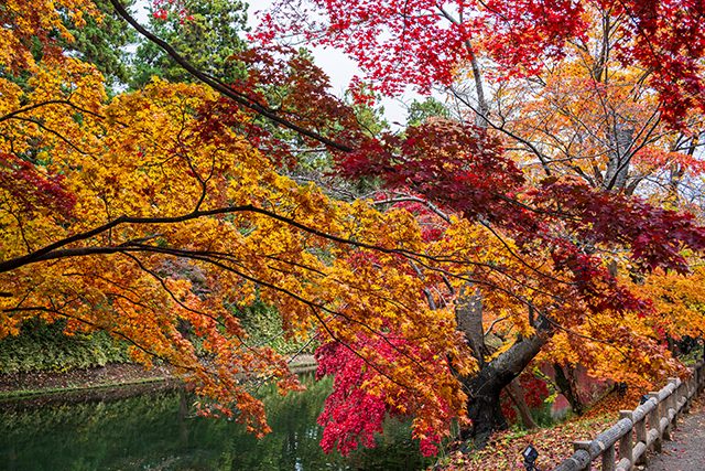 紅葉が見頃を迎える時期に合わせて、弘前公園にて「弘前城菊と紅葉まつり」が開催されます。園内には約2,600本の桜と約1,100本のカエデが植えられており、11月上旬になると紅葉が見頃に。夜はライトアップされ、園内に鎮座する弘前城、そしてプロジェクションマッピングとも相まって、幻想的な景色が広がります。昼間は露店が並び、ハンドクラフトなどの体験イベント、フラワーアートの展示や菊花展、ステージイベントが行われ、にぎやかな雰囲気に。17時までは城のおほりで舟に揺られながら紅葉を楽しむ「中濠紅葉観光舟」も運航しています。昼、夜、陸上、水上など、さまざまな時間、角度から弘前の紅葉を満喫してみては。