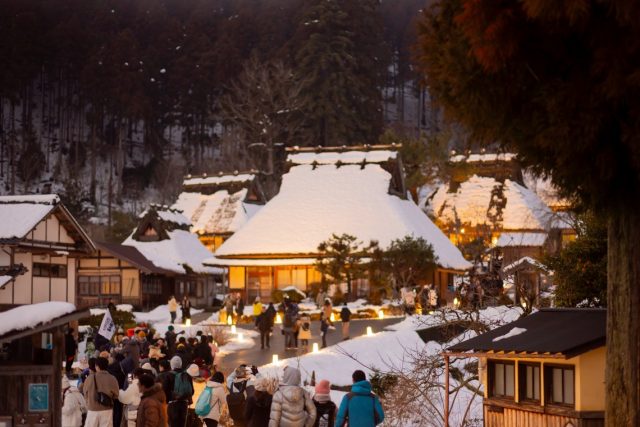 厳しい冬の季節に美山を訪れてくれた人たちを、雪で作った灯籠の光でもてなしたいという思いから始まった「美山かやぶきの里 雪灯廊」。しかし近年の深刻な雪不足により、2026年からは「美山かやぶきの里 冬灯廊」に名前を改めて開催することになりました。39棟のかやぶき屋根が現存し、日本の農山村の原風景に出会える「美山かやぶきの里」を5日間限定でライトアップ。開催期間中は毎日5店舗程度、屋台の出店がある他、1月21日限定で日本舞踊の奉納とお餅つき&ぜんざいの販売も行われます。路地行燈やLED灯籠の灯りで優しい光に包まれる冬の「美山かやぶきの里」。1年のうち、この5日間だけにしか出会えない特別な景色です。