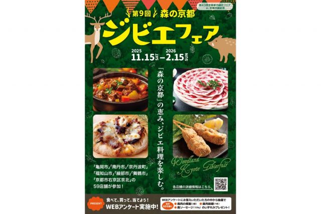 亀岡市、南丹市、京丹波町、福知山市、綾部市、京都市右京区京北の6市町で構成される“森の京都”エリアでは、今年も「森の京都ジビエフェア」を開催中です。近年、日本では野生鳥獣が増え過ぎ、農作物を食べたり田畑を荒らしたりすることから、農山村に深刻な影響を及ぼしています。そこで“森の京都”では鳥獣を食肉として有効活用し、鳥獣被害対策や地域活性化に取り組んでいます。対象店舗では和食、イタリアン、フレンチなどのジビエ料理を楽しめる他、加工品の販売も行っており、今まで知らなかったジビエのおいしさと出会える絶好の機会です。更に、フェア期間内に対象店舗を利用してWEBアンケートに答えると、鹿肉の燻製、鹿肉味噌、鹿ソーセージが抽選で当たります。